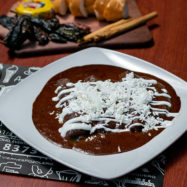 Enchiladas rellenas de chicharrón prensado guisado en salsa guajillo, bañadas con salsa morita