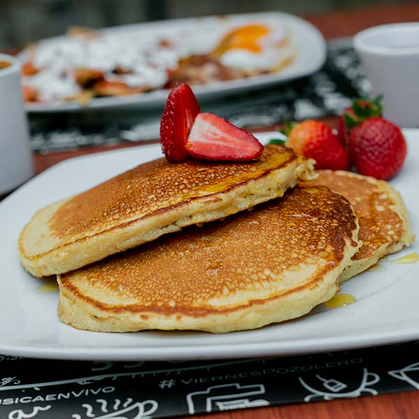 (Tres deliciosos Hot Cakes acompañados con Chilaquiles, tres tiras de Tocino Ahumado y 2 Huevos al gusto)